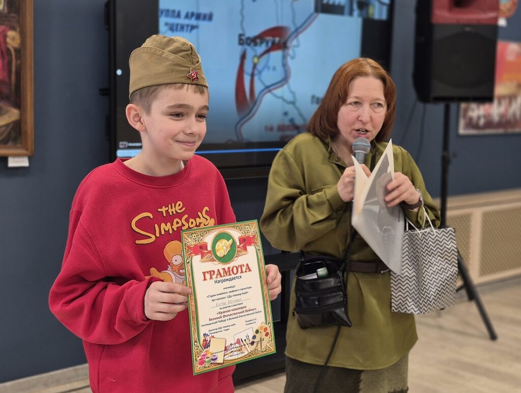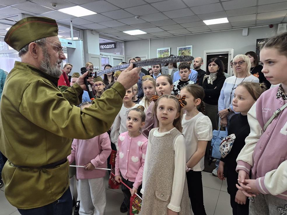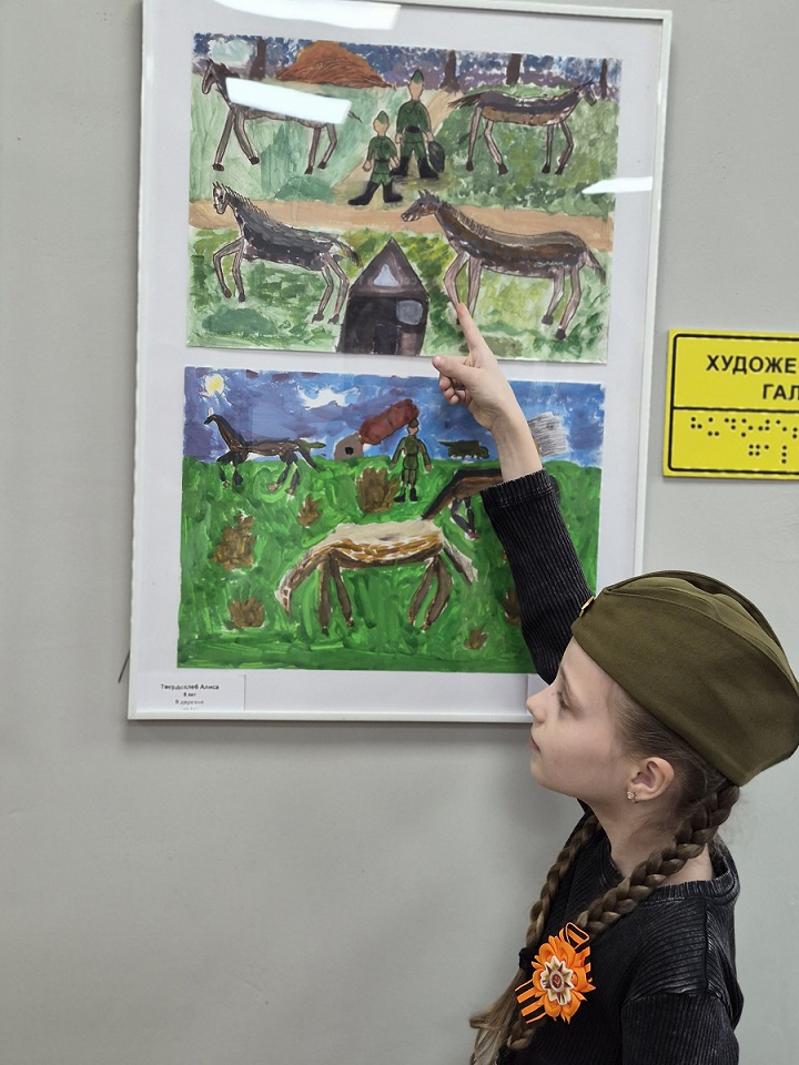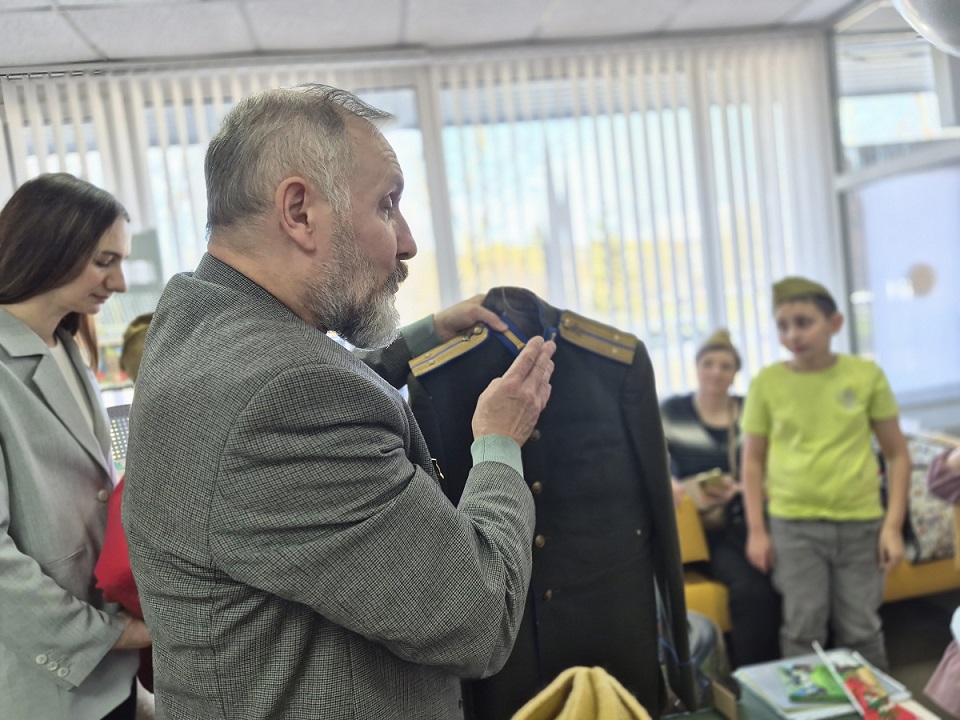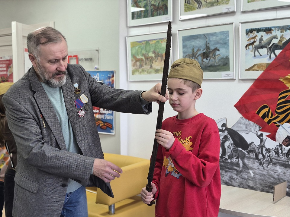Юные художники вместе с родителями стали участниками патриотической встречи, в которой принял участие ветеран боевых действий в Афганистане Александр Иванович Артамонов. Он показал детям настоящие военные реликвии – шашку, найденную поисковиками под Ржевом, парадный китель кавалериста, ремень. Военные артефакты можно было потрогать руками и таким образом прикоснуться к истории.
