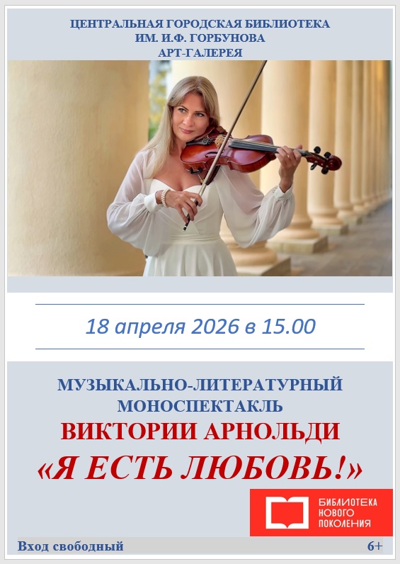 И вновь в арт-галерее зазвучит скрипка! По просьбам зрителей повторяем музыкально-литературный авторский моноспектакль «Я есть любовь!» в исполнении яркого, профессионального музыканта, скрипачки и вокалистки, композитора, актрисы театра АктэМ Виктории Арнольди. В спектакле прозвучат как всеми известные и любимые композиции, так и авторские песни Виктории. Ждём вас 18 апреля в 14.00 в арт-галерее библиотеки Горбунова.